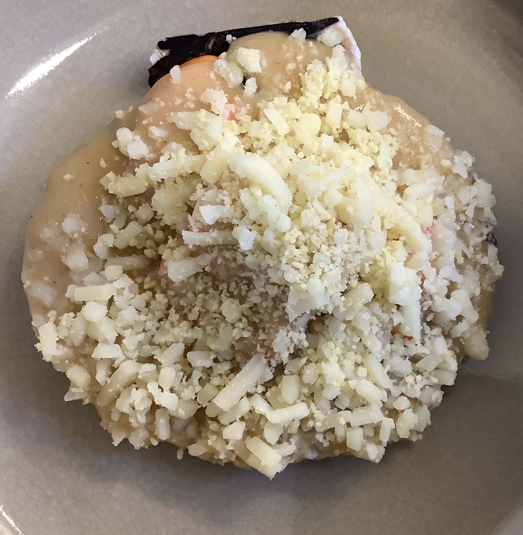 een klein Sint-Jacobschelpje dat afgewerkt wordt met extra zeevruchtjes en fijne groenten
