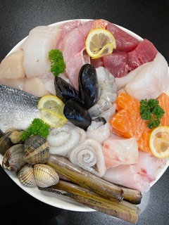 vergezelt van 1/2L visbouillon per persoon en vissaus.